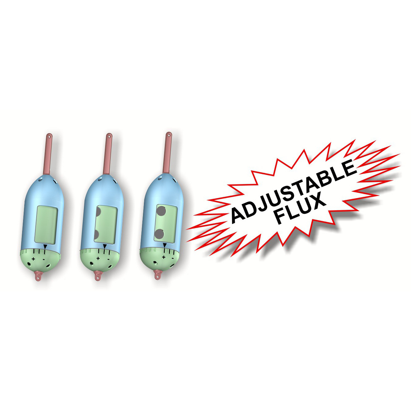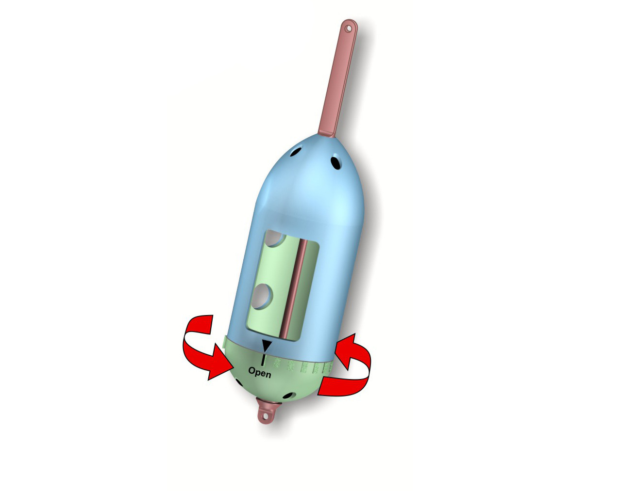 Pasturatore ideale per la pesca di superficie. Anche se pieno di esche (circa gr 15 di bigattini) si mantiene a galla. La regolazione della grandezza dei fori consente di variare il flusso delle esche.